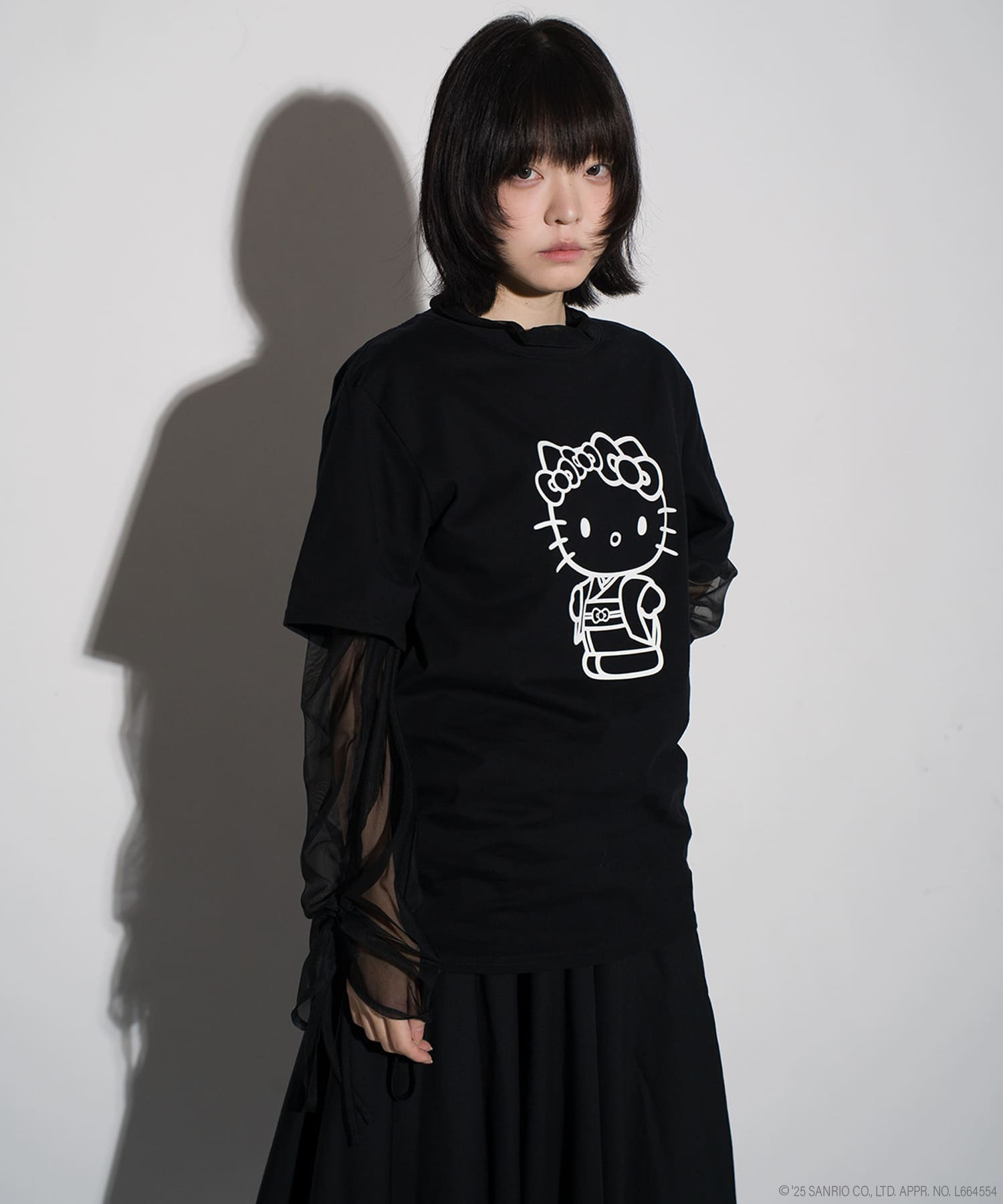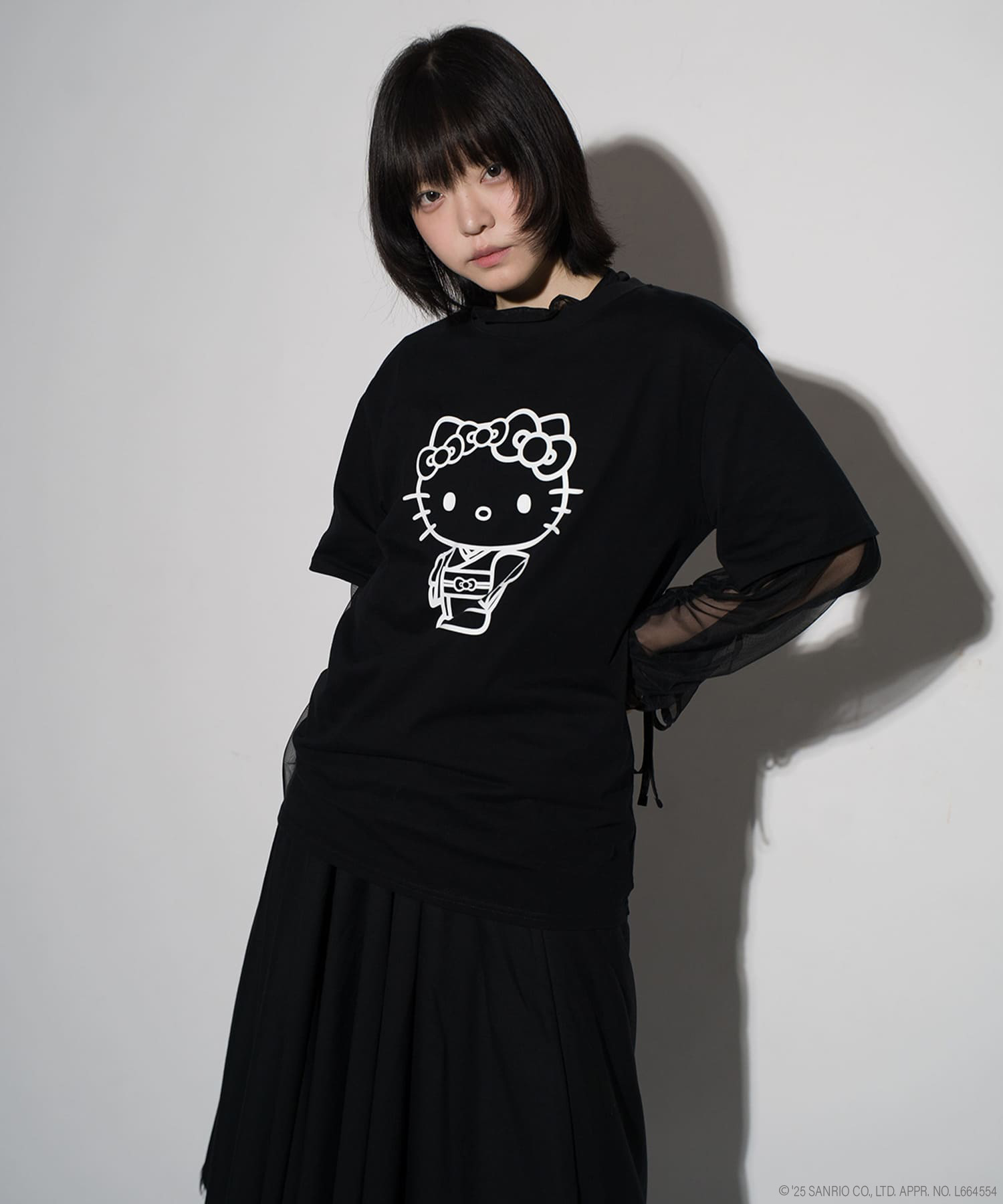 フロントに大胆にあしらわれたのは、着物姿のハローキティ。ブランドらしい和のテイストを纏ったキティが、モノトーンで統一されたラバープリントによって、ポップでありながらも洗練された印象を与えます。コントラストの効いたデザインは、ストリートスタイルにもモードな着こなしにも自然に溶け込み、着る人の個性を引き立てます。