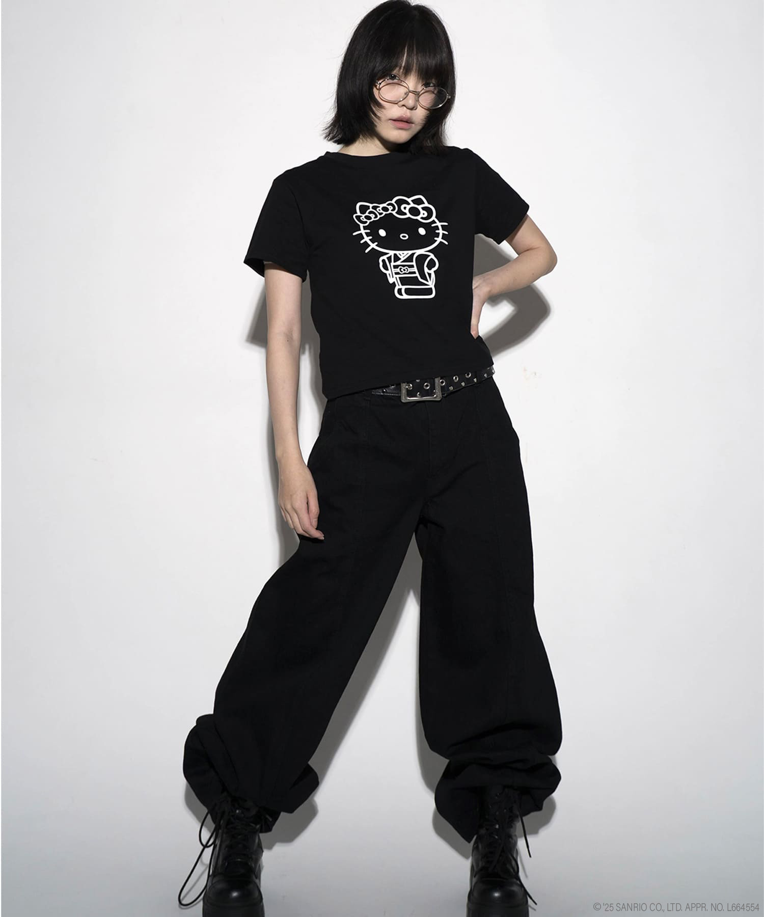 フロントに大胆にあしらわれたのは、着物姿のハローキティ。ブランドらしい和のテイストを纏ったキティが、モノトーンで統一されたラバープリントによって、ポップでありながらも洗練された印象を与えます。コントラストの効いたデザインは、ストリートスタイルにもモードな着こなしにも自然に溶け込み、着る人の個性を引き立てます。