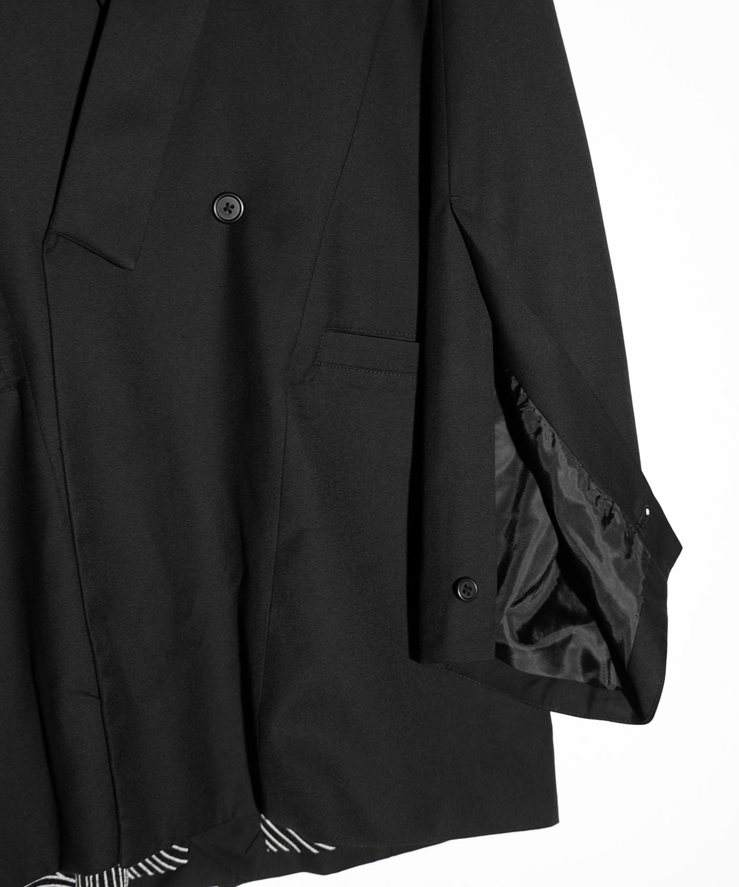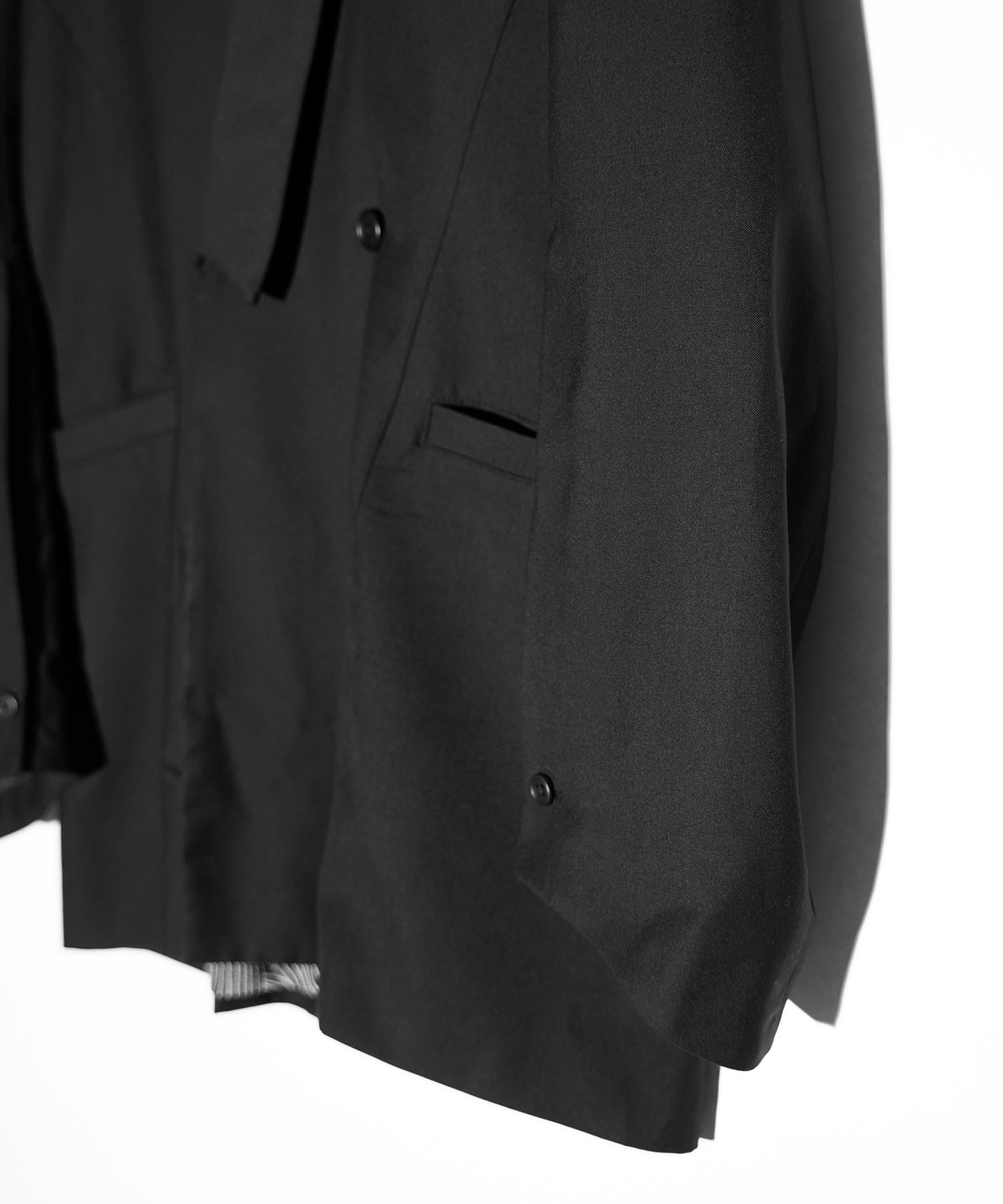 また、袖口のボタンを外すことで、生地に意図的な「遊び」や「たわみ」が生まれ、着用者がシルエットの緩急を自在にコントロールできる構造となっています。