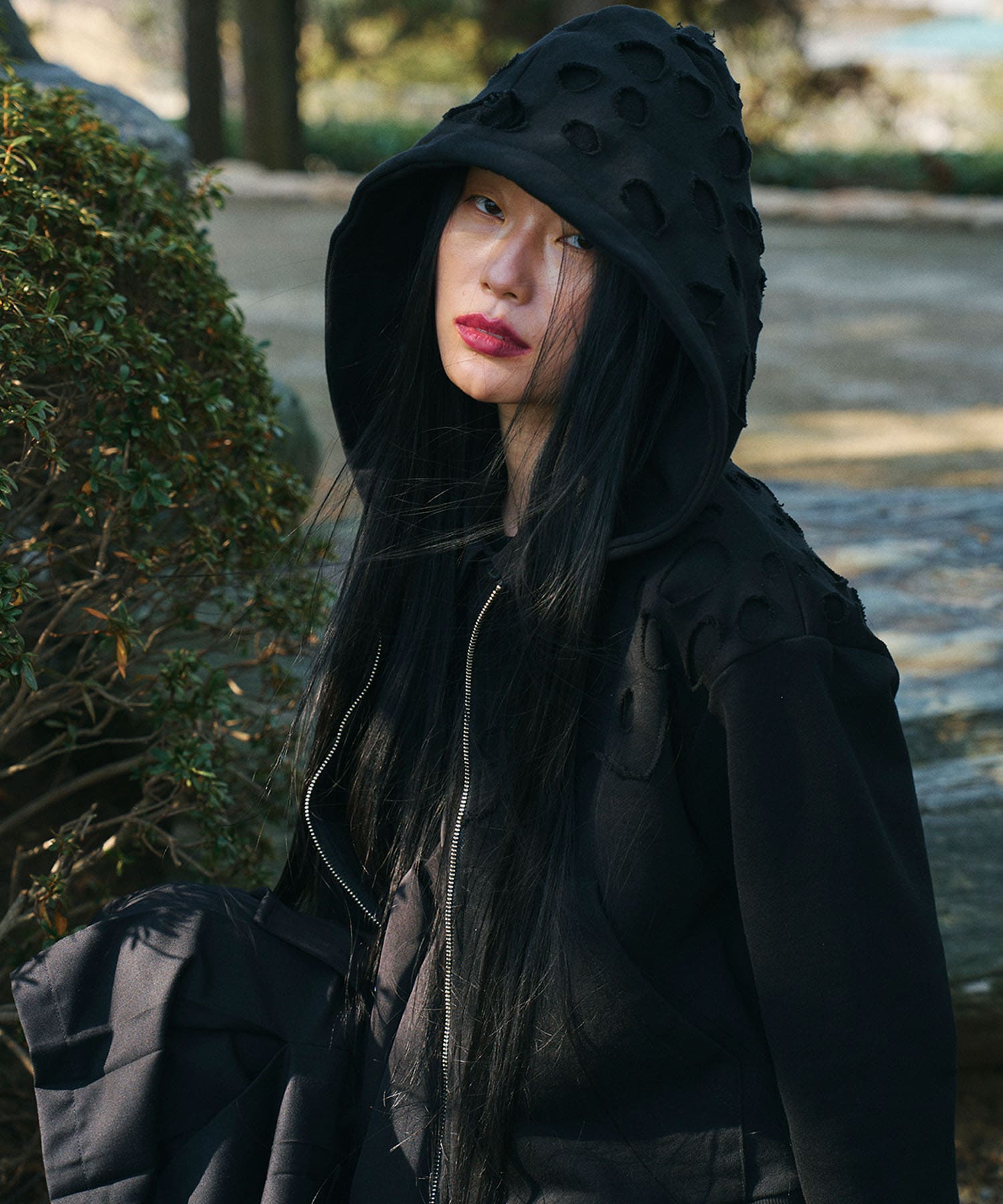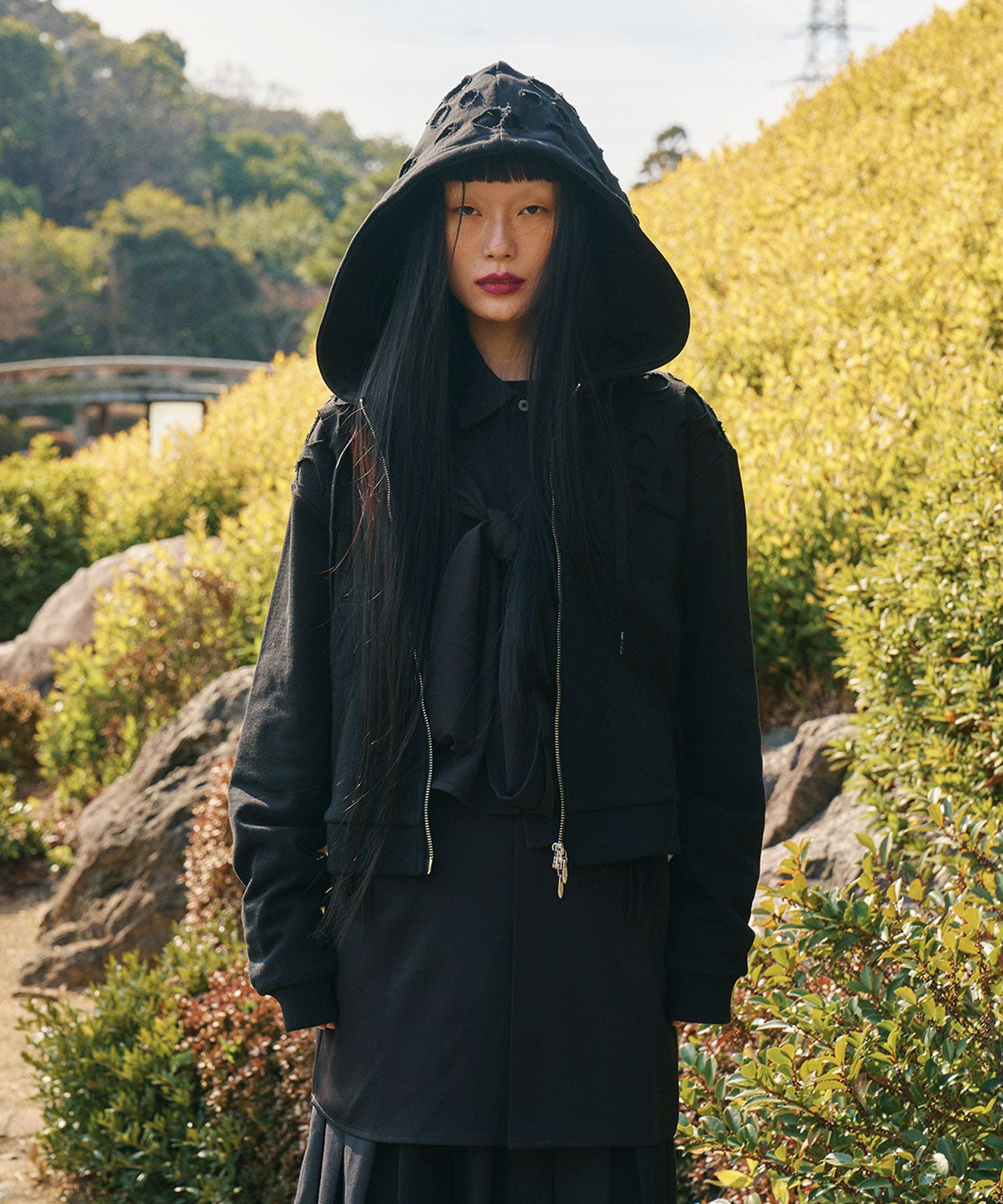 身頃からフードにかけて施された穴あきのディテールはイリオモテヤマネコの体表の斑点模様からインスピレーションを得てデザインへと落とし込みました。この小さな穴あきは、機械に頼らず、人の手によって一つ一つ丁寧にカットアウトされたもので、アイテムそれぞれに少しずつ個体差があります。量産品にはないクラフトマンシップと、野生の不規則な美しさを纏った、特別な一着です。