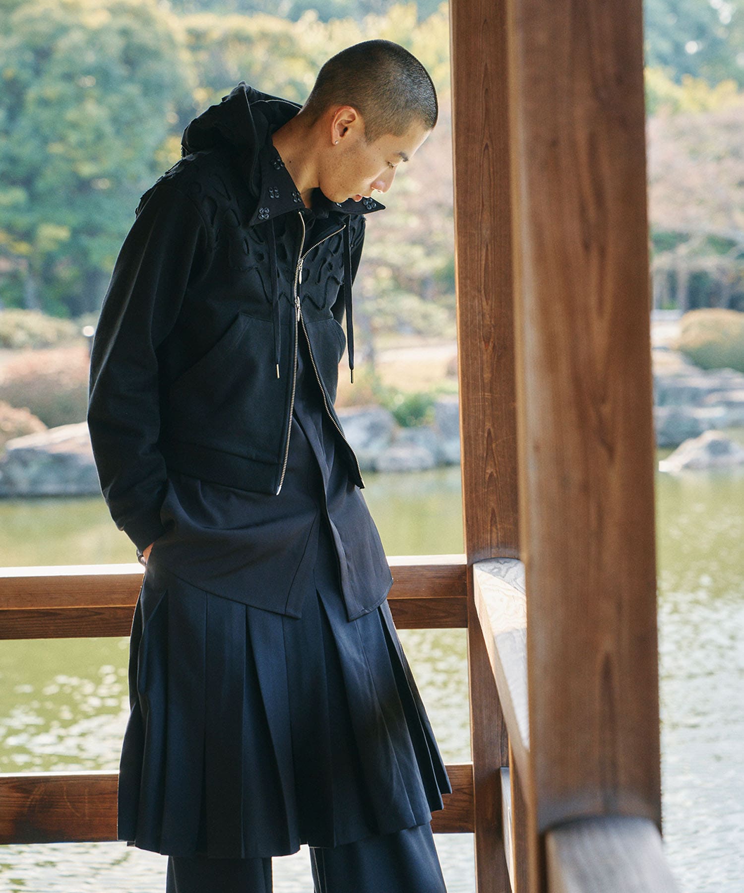 ハンガーにかけた状態では規則正しい表情を見せますが、歩き出すと途端に表情が変化し、プリーツが風をはらんだり、動きに合わせて不規則に揺らめいたりすることで、まるで裾が軽やかに羽ばたいているような、生きた動きが生まれることを想像して製作しました。