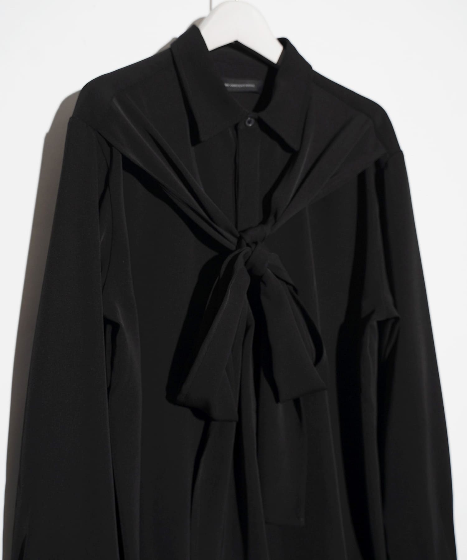 両肩のラインから垂れ下がる、長く設計されたタイディテールが最大の特徴の一枚です。