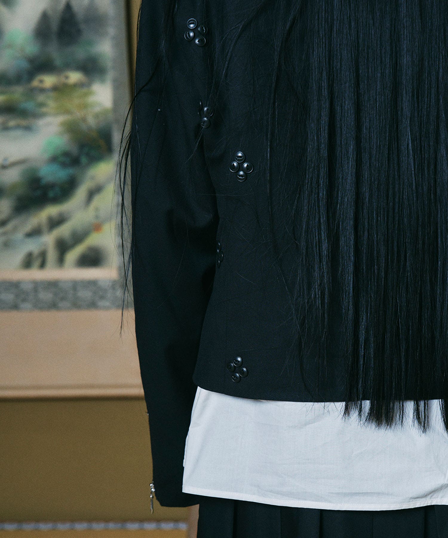 身頃全体に規則的にちりばめられた小さな釦たちはヤマネコの足跡を表現しています。