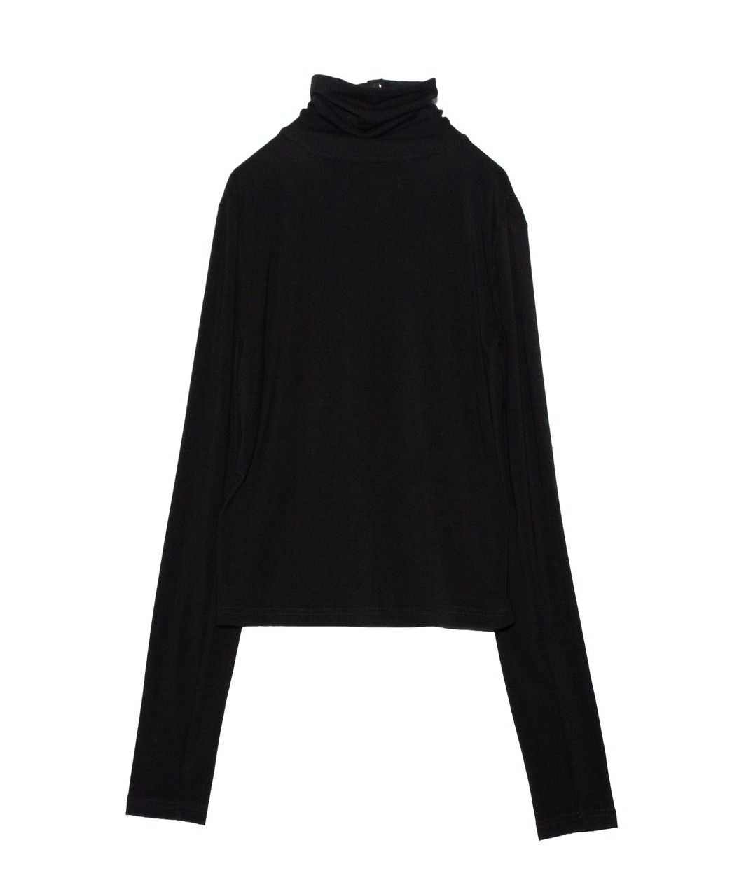 A unique 2-way ring-snap jersey top whose neckline transforms with the buttons: fasten it for a turtleneck-inspired look, or leave it open for a shirt-collar style. The placket is cut from contrasting georgette, adding a subtle play of texture. Polished ring-snap buttons bring a modern edge to the minimalist look. Thumbholes at the cuffs are a functional detail that truly shines when layered under outerwear. Finished with a body-skimming slim silhouette for a gender-inclusive fit.