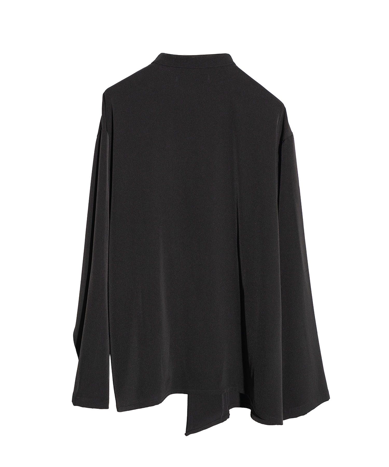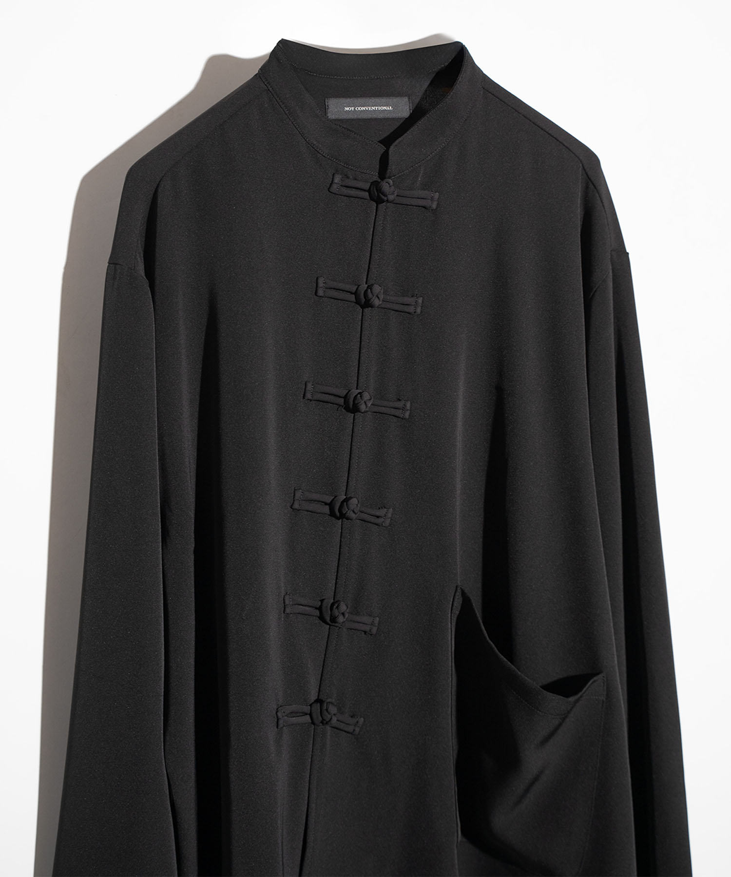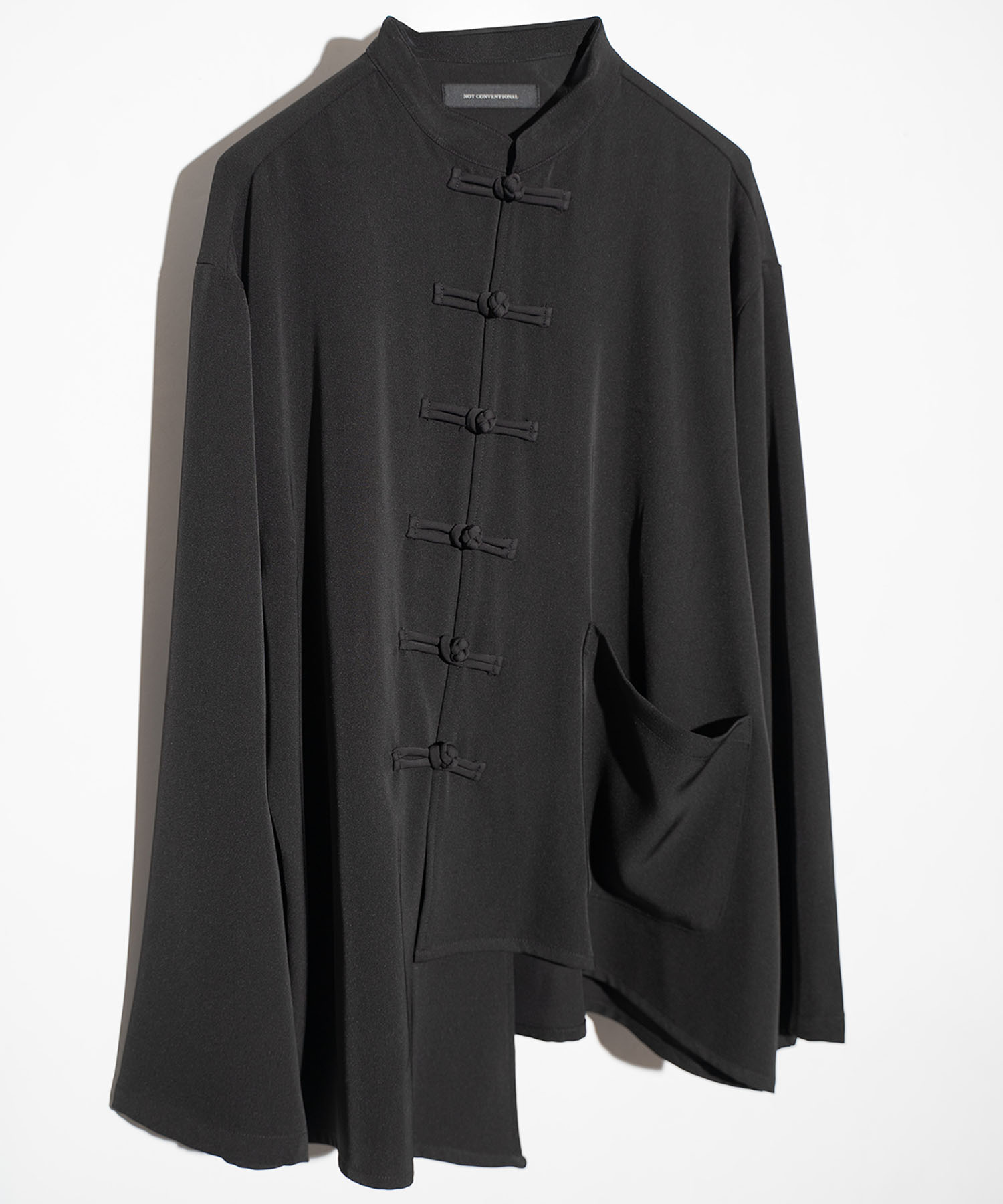 NOTオリジナルのサテン生地を使用したアシンメトリーチャイナシャツ。