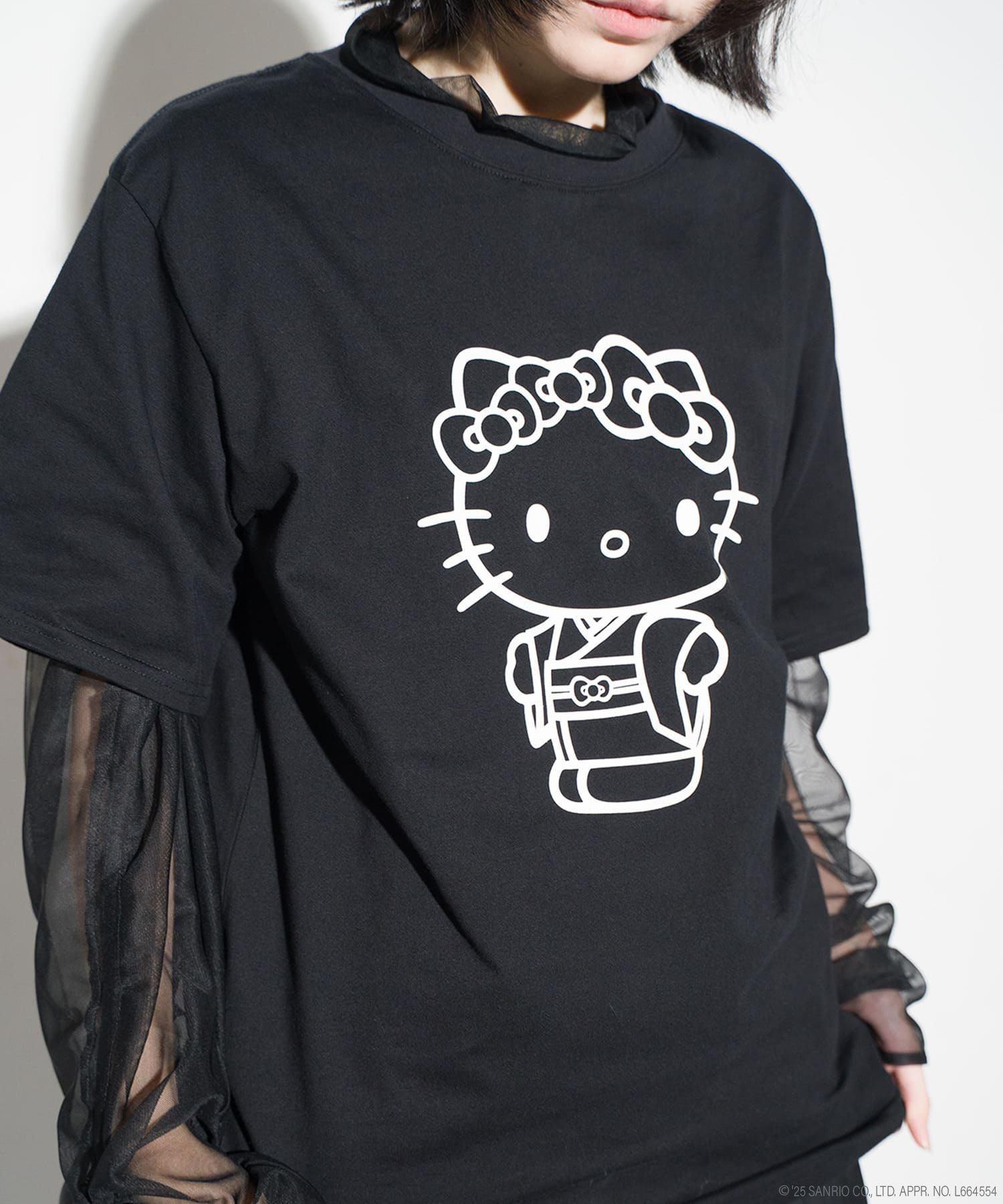 フロントに大胆にあしらわれたのは、着物姿のハローキティ。ブランドらしい和のテイストを纏ったキティが、モノトーンで統一されたラバープリントによって、ポップでありながらも洗練された印象を与えます。コントラストの効いたデザインは、ストリートスタイルにもモードな着こなしにも自然に溶け込み、着る人の個性を引き立てます。