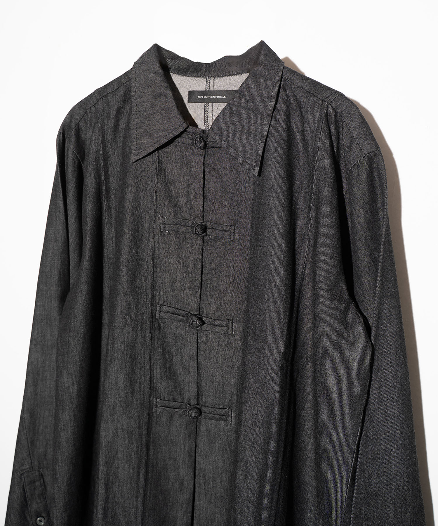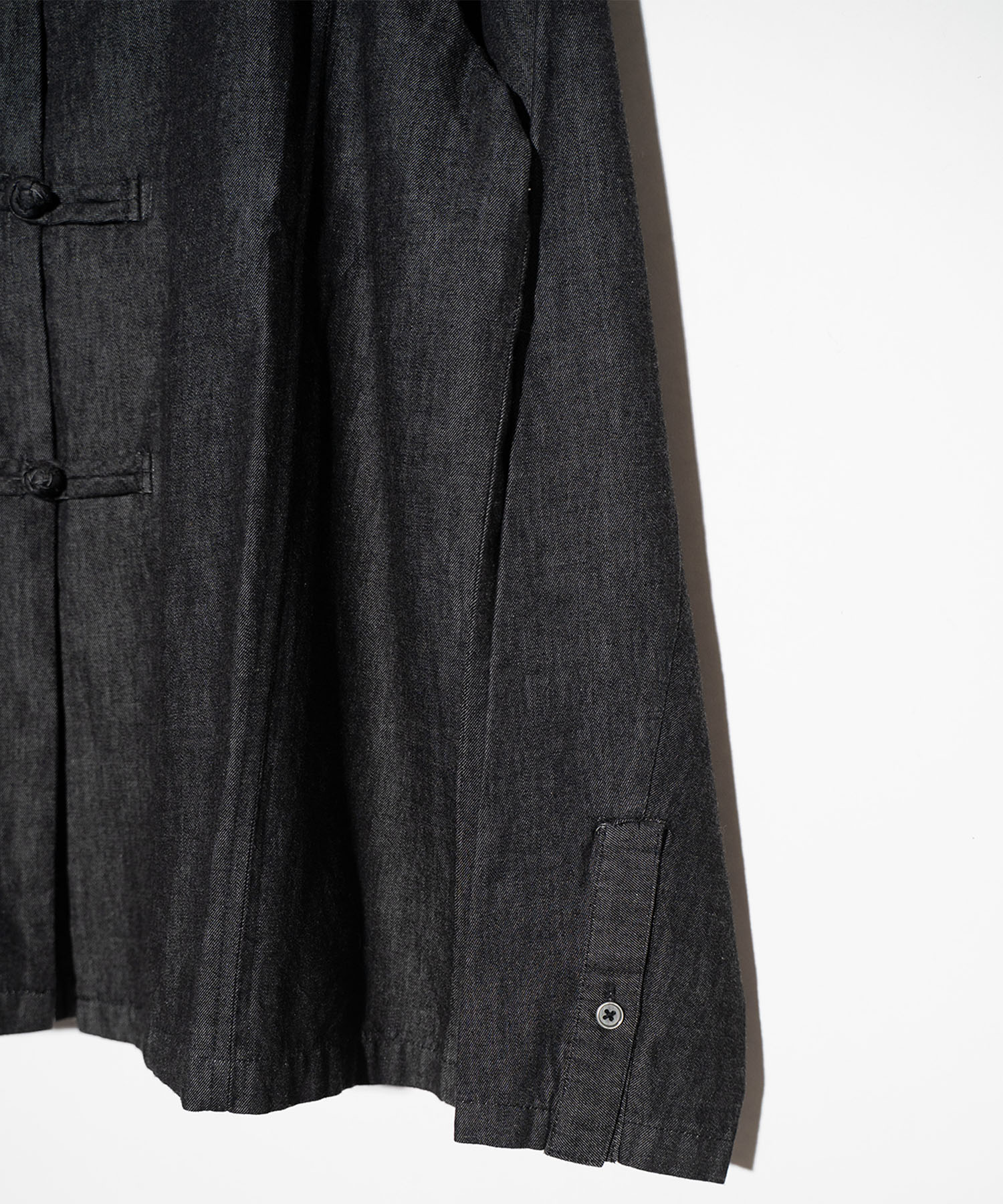 カジュアルになりがちなデニムシャツをNOT独自のモードな世界観に昇華させ、ミニマルな印象のチャイナシャツに仕上げました。