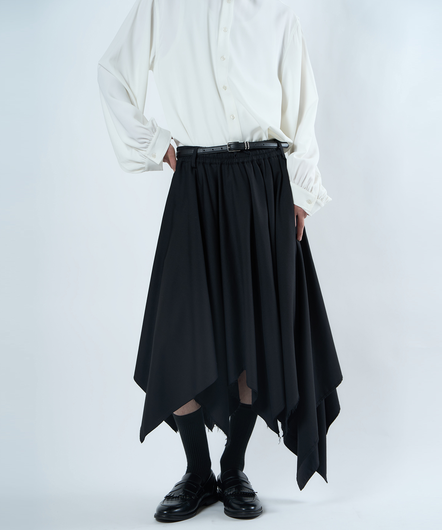 Using NOT’s original T/R fabric (polyester/rayon), the use of fine-count yarn gives it a unique sheen and beautiful drape.The two panels on the left side can be draped to create an asymmetrical silhouette, or tied together to form a wrap-style skirt, offering a variety of styling options.You can layer it over pants to give your outfit a unique twist, or simply wear it as a skirt.