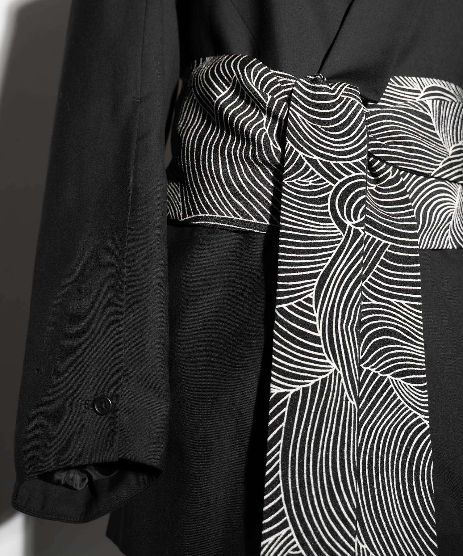 付属品として、ちりめん生地の帯が付属し、この帯をウエストに巻き付けることで、流動的なシルエットが一転し、和を感じさせる凛としたフォーマルな印象へと引き締められます。