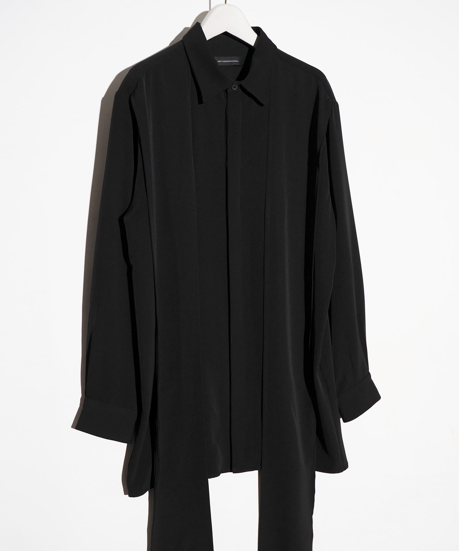 "NOTオリジナルのサテン生地を使用したロングタイジャケット。